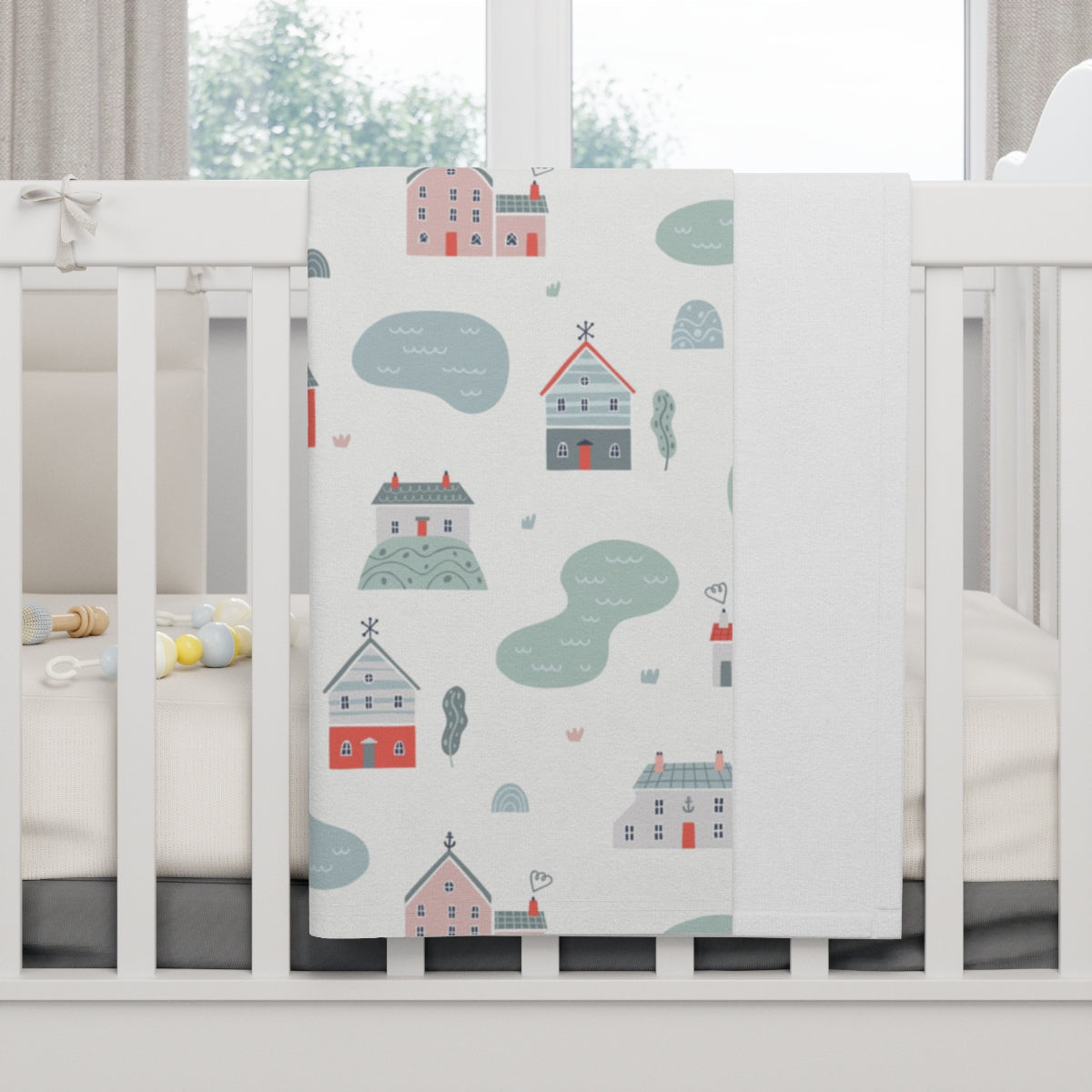 Snuggle up with one our cute and oh so soft plus baby blankets. Available in a large selection of cute prints and modern designs which are perfect as a baby gift or simply to add a pop of color to your baby's nursery or child's bedroom. Our baby blankets are perfect for snuggling up to watch a movie, keeping your little one warm when going for a walk in a stroller, or simply being cozy when taking a cat nap. This baby blanket features a serene East Coast seaside village, with a classic neutral color palette.
