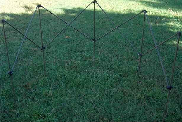 Includes a Steel folding metal blind with carry bag. The folding metal blind has four (4) sections that are hinged. You can form an arc to hide behind, or form a square and hide inside. Use it to wrap around the front of a tree as you lean againts the tree. When the frame is fully erected it measures 9' long, by 36" high. Plenty large enough for yourself, and a friend. Will fit both a Sniper and his Spotter. The ends of the frame have plastic pointed tips you insert into the ground to secure the unit. These should be inserted at least 4" into the ground.