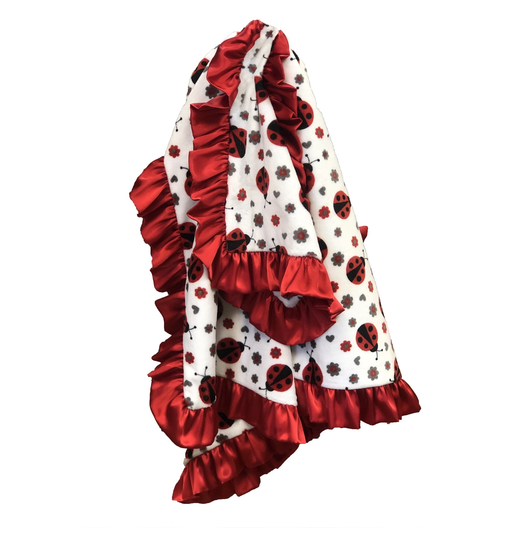 This warm & cozy keepsake blanket is trimmed w/ a luxurious silky satin red ruffle.